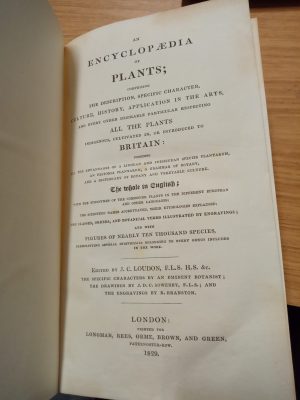 Recently rebound in half leather / imitation leather, dark green with gilt spine titles and 5 bands; green boards; modern cream endpapers; in Fine condition with just the smallest trace of rubbing to the top and tail of the spine. Internally remarkably crisp, clean and bright with almost no foxing or age-toning. Includes numerous drawings of various plant species on the majority of pages throughout the text. xx,[2],1159pp. Overall Fine. Photos available on request. A superb copy. Full title: ‘An encyclopaedia of plants; Comprising the description, specific character, culture, history, application in the arts, and every other desirable particular respecting all the plants indigenous, cultivated in or introduced to Britain: combining all the advantages of a Linnean, Jussieuean Species Plantarum, an Historian Plantarum, A Grammar of Botany, and a dictionary of Botany and Vegetable Culture.’