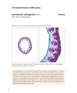 Anatomy of Grass Culms is based on cross sections of culms. Each section of 300 Poaceae specimens taken from natural sites are located in internodes above leaf sheathes, approximately in the middle part of the total length of culms. All genera are analyzed but only one specimen of each species which occurs in the alpine region is shown. The material includes species of all vegetation zones from 100 to 3000 m a.s.l. of all possible habitats from wet to arid, from calcifuge to acid, and from nutrient-rich to poor and salty sites. Endemic and introduced species are included. Since anatomical variation is minimized by sectioning all culms at the same location, the whole set of analyzed material is comparable. Double staining gives additional information about the distribution of lignifed and unlignifed parts. With this sampling and preparation strategy the authors describe general culm characteristics and modifcations related to ecology and taxonomy.