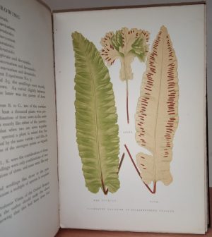 Scarce. Original cloth boards with gilt spine titles and gilt fern decoration to spine and cover; untrimmed edges. Light wear and bumping to the cover extremities and light marks to the boards. Internally fairly crisp, clean and bright with a little light foxing, moreso to the first and final couple of leaves. Owner inscription to FFEP. Incl. 59 illustrations within the text and 3 plates in lovely condition, including Variegated Varieties of Scolopendrium Vulgare in full colour. An attractive copy of the scarce 1st edition.