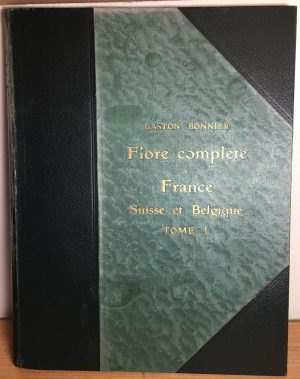 C. 1911 – 1934. 12 volumes + the index, each in a good quality black imitation / bonded half-leather binding with green silky textured cloth covered boards, gilt titles to spine and front boards and floral green endpapers, with the exception of the more recently bound volumes 10, 11 & 12, whose boards are of green linen, without the silky texture and appearance, and which have white endpapers. Lightly bumped with a little wear showing the cloth layer to the extremities of the spines. Vol 1 has some minor water damage to front cover and pencil marks to front endpaper. Internally very crisp and clean. Almost no foxing. Overall VG+. Photos available on request. All colour plates of species, as well as a large number of subspecies and varieties, are reproduced at half their natural size based on photographs. The main Table Generale (index) gives the names of families, genera, species, sub-species and varieties in Latin. There is also a table of plant families in French and a section on corrections and additions to the text. A beautiful, complete set.