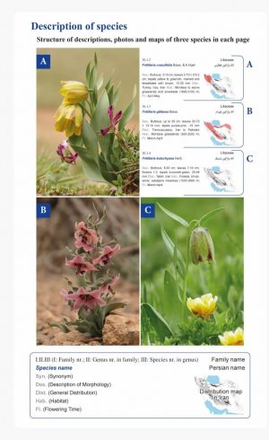 In this book, a total of 1,584 vascular plant species of Alborz mountain range in 647 genera and 117 families are presented. Of those, 22 species are pteridophytes (in 16 genera and 12 families), eight species are gymnosperms, 242 species are monocotyledons, and 1,312 species are dicotyledons. The order of the families are evolutionary and based on the latest APG classification, but the genera and species are alphabetically arranged. The morphology of each species is briefly described. Moreover, general distribution, habitat types, flowering time and a map showing the distribution range inside of Iran for each species are presented. All photos have been taken in the wild and at natural habitats.