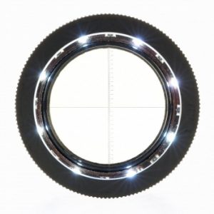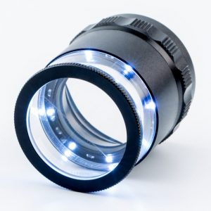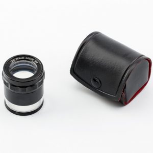 A KIMAG LED precision illuminated scale loupe measuring magnifier 10x with an achromatic (chromatic aberration corrected) coated optic system consisting of 4 elements and 2 component assemblies. The measurement scale is made of glass and has a graduation 0.1 mm with a measuring length of 30 mm. The housing contains a ring consisting of 8 LEDs, which provides for a bright and high-contrast illumination of the measuring field.