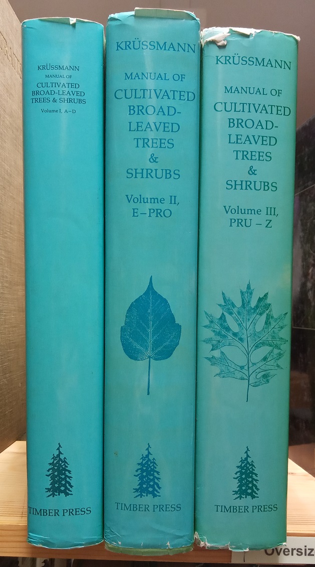 3 volume set consisting of Vol. 1: A-D, 1984, ISBN 0917304780; Vol. 2: E-PRO, 1985, ISBN 0881920053; and, Vol. 3: PRU-Z, 1986, ISBN 0881920061. Translated from the German 1976,7,8 publications entitled Handbuch der Laubgehölze, published by Verlag Paul Parey. All crisp and clean with very light age toning, with the exception of slight soiling / spotting to outside edges. Light wear to extremities of boards only. DJ’s a little edge worn and bumped with spines faded to blue. Illustrated throughout with black and white line drawings.