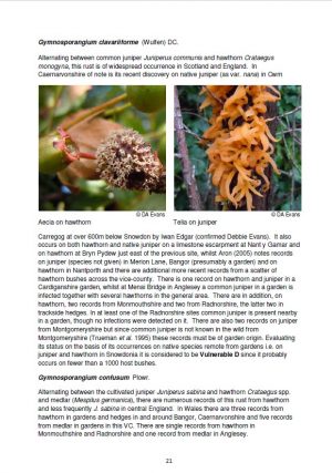 Rust Fungus Red Data List and Census Catalogue for Wales provides not just a listing but notes with colour photographs on individual taxa. Some details on the locations of rare rusts of Wales are provided including host taxon, habitat and vice county in tabular form as well as more specific details in the notes.