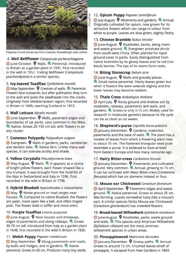 The Urban plants guide features 45 different plants found growing wild in towns and cities in Scotland. It will also be useful for towns and cities in northern England (northwards from Manchester and Leeds).